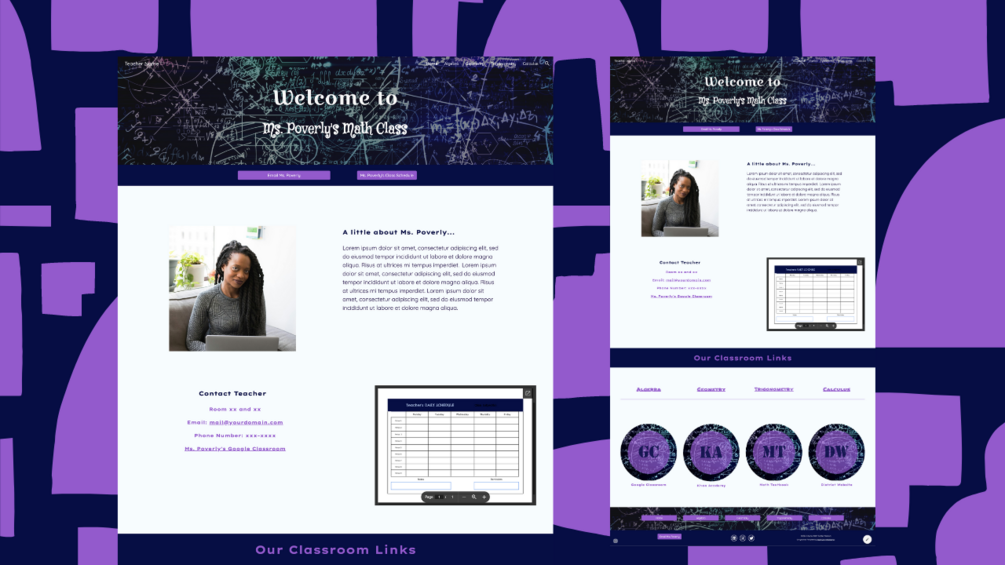 Our beautiful premium Google Sites Template for middle school and high school Math teachers is easy to use and customize. The Haynes Math Teacher template has an abstract purple and green math header and includes 5 pages: